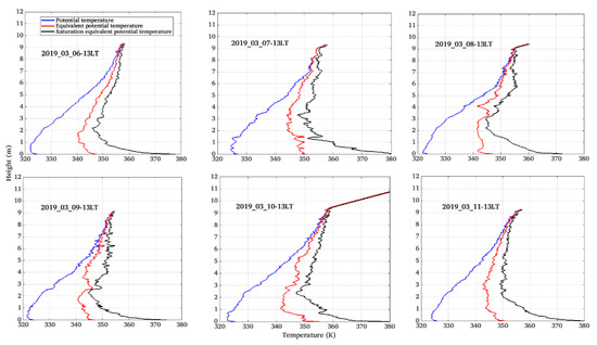 Equivalent potential temperature, saturation equivalent potential temperature and potential temperature calculated from the radiosonde data for 06–11 March at 13 LT.