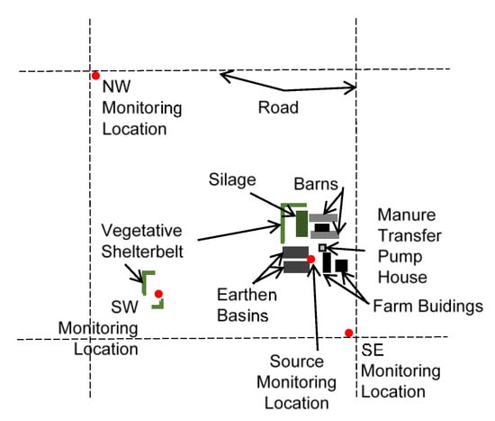 Layout and monitoring locations around a dairy facility for the dairy case study (not to scale).