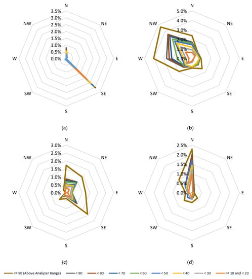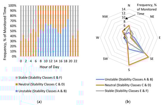 For the swine case study, Hofer [] only reported data when wind was blowing from S to SE direction, which accounted for 29% of the monitoring period. The majority of the S–SE winds were neutral (Figure 7). Approximately 10% of the nighttime winds were stable and 11% of the daytime winds were unstable.