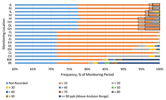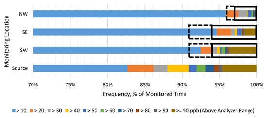 Cumulative frequency of hydrogen sulfide concentration measurement ranges from low to high (in 10 ppb increments) at the monitoring locations for the dairy case study. The dashed black boxes indicate the range of time when the South Dakota Odor Footprint Tool estimates the onset of odor annoyance for the distance away from the source (dairy farm), and the black boxes indicates the remainder of the range of time of odor annoyance from onset.