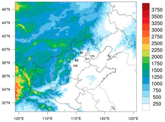Model simulation domain and topography height (m). (BJ: Beijing; TJ: Tianjin; BD: Baoding; SJZ: Shijiazhuang; TS: Tangshan).