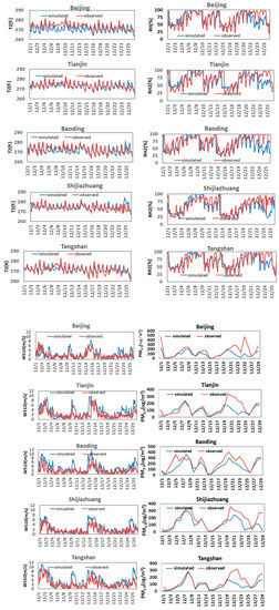 In this study, meteorological factors were obtained from the China Meteorological Administration observation network, namely, the Meteorological Information Comprehensive Analysis and Process System (MICAPS). The monitoring data were collected from five MICAPS sites to evaluate the meteorological simulation performances (Beijing site: lat. 116.28, lon. 39.48; Tianjin site: lat. 117.03, lon. 39.05; Baoding site: lat. 115.29, lon. 38.44; Shijiazhuang site: lat. 114.25, lon. 38.02; Tangshan site: lat. 118.06, lon. 39.39). The monitored air pollutant data for this research were collected from the website of China National Environmental Monitoring Centre (CNEMC). This website publishes hourly air quality information for 367 monitored cities in China. The hourly air pollutant concentrations from the CNEMC were collected to evaluate the simulation performances. The model was validated by comparing the results of the scenario1 simulation and the observed results for surface PM2.5 concentrations, T2, 10 m wind speed (WS10), and RH2. The normalized mean gross error (NME), normalized mean bias (NMB), and correlation coefficient (RC) were used for the statistical analysis based on a previous study [37] and the U.S. EPA model evaluation protocol [38].