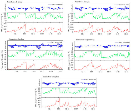 The evaluation statistics of T2 (K), RH2 (%), and WS10 (m s−1) for Beijing, Tianjin, Baoding, Shijiazhuang, and Tangshan are summarized in Table 3. Figure 2 presents the hourly simulated and observed meteorological variables and the PM2.5 results. The WRF-Chem simulation results adequately captured the variations in T2 in these regions, with correlation coefficients of 0.72, 0.75, 0.71, 0.53, and 0.78 in Beijing, Tianjin, Baoding, Shijiazhuang, and Tangshan, respectively. The NMB and NME indicated good model performance for T2. The NMB values of T2 were between −1.00% and 1.00%, and the NME values of T2 were 1.00%, 0.58%, 0.81%, 0.98%, and 0.75% in Beijing, Tianjin, Baoding, Shijiazhuang, and Tangshan, respectively. As shown in Table 3, Beijing, Tianjin, and Tangshan showed the smallest NMB and NME values for the RH simulation. Baoding and Shijiazhuang presented relatively large biases for the RH simulation, and they are located in heavily polluted areas. The RH2 simulation results had correlation coefficients between 0.59 and 0.74. The simulation results adequately captured the variations in WS10. All correlation coefficients were greater than 0.5. However, as the analysis nudging option was not applied in the model, overpredictions occurred for hourly WS10 in the regions, with average bias values between 17.9 and 67.44 at five sites. The evaluation of the PM2.5 concentrations in Beijing, Tianjin, Baoding, Shijiazhuang, and Tangshan is also shown in Table 3. The NMB values for the comparison results of PM2.5 were −41.37%, 24.66%, 28.35%, 30.95%, and −34.79% in Beijing, Tianjin, Baoding, Shijiazhuang, and Tangshan, respectively. The NME values of PM2.5 from the different sites were generally between 32.83% and 43.76%. The correlation coefficients of the PM2.5 concentrations between the simulated and observed values were 0.67, 0.58, 0.80, 0.74, and 0.80 in Beijing, Tianjin, Baoding, Shijiazhuang, and Tangshan, respectively. The model simulation results can clearly represent the air pollution process. The high uncertainty of emission inventories and meteorological simulation results affected the accuracy of the air pollution simulation results. A previous study also showed a large bias during heavily polluted days, which is an inherent characteristic that the model can produce [39]. According to the U.S. Environmental Protection Agency [38], all parameters followed the guidelines, and the WRF-Chem model predicted variables reasonably well in this work.