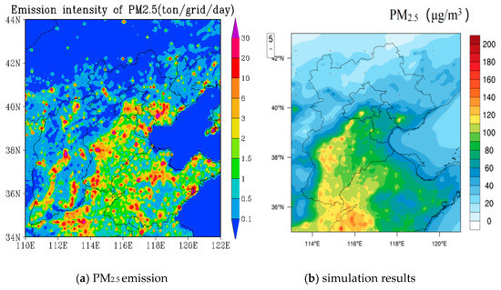 Figure 3 presents the hourly temporal variations in PM2.5 concentration and the meteorological parameters (wind speed and humidity) in Beijing, Tianjin, Baoding, Shijiazhuang, and Tangshan in December 2015. Five pollution episodes occurred in December 2015 in these regions. The figure also shows that PM2.5 concentrations are negatively correlated with wind speed, which contributes to the dispersion of PM2.5 pollutants. PM2.5 concentrations are positively correlated with RH, which means the precursors (SO2, NOx, NH3, and volatile organic compounds (VOCs)) have the tendency to convert to PM2.5 through chemical reactions. Figure 4 shows the spatial distributions of the PM2.5 emission inventory, the mean simulation, and the monitor concentration in the BTH region over the simulation period. The cities of Shijiazhuang, Baoding, and Beijing and the southern part of the BTH region had high pollution emissions and heavy air pollution. Heavy pollution formed in the southern parts of the region (e.g., Shijiazhuang, Xingtai, and Handan) and spread towards the northern parts of the region (e.g., Zhangjiakou and Chengde). Eventually, pollution accumulated in front of the Taihang and Yanshan Mountains in the northern and western parts of the region.