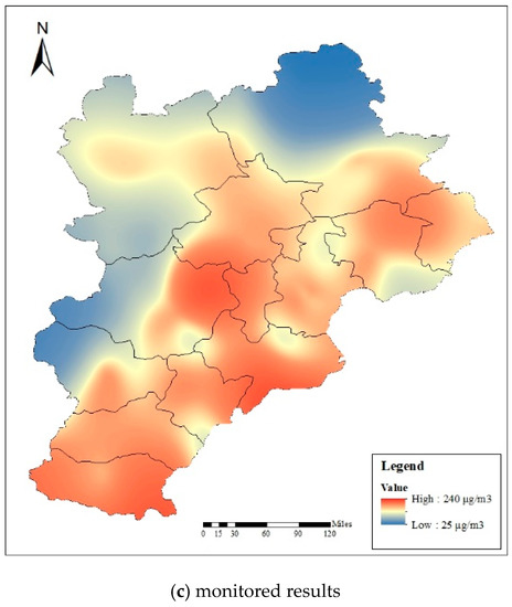 The spatial distributions of the PM2.5 emission inventory, the mean simulation, and the monitored PM2.5 concentration from the scenario 1 simulation. (a) PM2.5 emission, (b) PM2.5 concentration simulation results, (c) PM2.5 concentration monitored results.