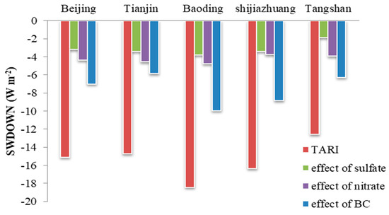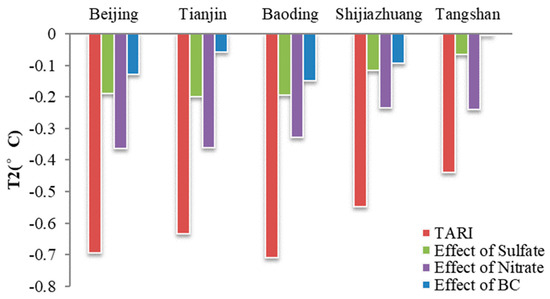 As aerosols reduce incoming solar radiation by scattering and absorption, the surface temperatures decrease. T2 was reduced by up to 1.5 °C in the southern BTH region, of which the cooling effect occurred over most parts of the region, as shown in Figure 7. T2 was reduced by 0.69 °C, 0.63 °C, 0.72 °C, 0.55 °C, and 0.44 °C in Beijing, Tianjin, Baoding, Shijiazhuang, and Tangshan, respectively, over the simulation period, as shown in Figure 7. T2 decreased in the five cities due to the aerosol feedback effect caused by NO3−, SO42−, and BC, as shown in Figure 8. The temperatures fell by averages of 0.36 °C, 0.36 °C, 0.33 °C, 0.24 °C, and 0.24 °C in Beijing, Tianjin, Baoding, Shijiazhuang, and Tangshan, respectively, due to nitrate. The temperatures fell by averages of 0.19 °C, 0.20 °C, 0.20 °C, 0.12 °C, and 0.07 °C in Beijing, Tianjin, Baoding, Shijiazhuang, and Tangshan, respectively, due to sulfate. BC produces both cooling and heating effects, which was reported by a previous study [12]. On the one hand, when a BC aerosol enters cloud droplet, it enhances the radiation absorption ability of the cloud droplet and leads to a temperature increase. On the other hand, it also promotes the cloud-forming process by acting as cloud condensation nodules and improves cloud reflection. Thus, BC aerosols can cause a surface cooling effect. In this paper, the temperatures fell by an average of 0.13 °C, 0.06 °C, 0.15 °C, 0.09 °C, and 0.00 °C in Beijing, Tianjin, Baoding, Shijiazhuang, and Tangshan, respectively, which was due to BC. The monthly mean ARI effects on T2 under different PM2.5 pollution levels in the five cities are provided in Table 5. During the pollution period, the temperatures fell by averages of 0.94 °C, 0.25 °C, 0.5 °C, and 0.14 °C due to the TARI, SO42−, NO3−, and BC, respectively, in the five cities. The temperatures fell by averages of 0.28 °C, 0.06 °C, 0.13 °C, and 0.04 °C due to the TARI, SO42−, NO3−, and BC, respectively, in the five cities during the nonheavy pollution period. The warming effect of BC aerosols caused the temperature to increase by 0.04°C in Tangshan when the PM2.5 concentration was higher than 75 μg m−3.