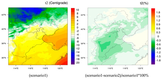 The ARI effects on SWDOWN were examined, whose spatial distributions over the region in December are shown in Figure 5. The left-hand graphs in Figure 5 are the mean distributions of the meteorological variables from the scenario1 simulation. The right-hand graphs in the figure are the relative differences between the scenario1 and scenario2 simulations. The spatial mean contributions of the ARI effect to SWDOWN average were decreases of 14.83 W m−2, 14.48 W m−2, 18.53 W m−2, 16.19 W m−2, and 12.26 W m−2 in Beijing, Tianjin, Baoding, Shijiazhuang, and Tangshan, respectively, over the simulation period. The ARI decreased the SWDOWN in the region, particularly in areas with severe PM2.5 pollution. The SWDOWN decreased in five cities due to the ARI effects of BC, SO42−, and NO3−, as shown in Figure 6. The BC absorption effect on solar radiation was stronger than the effects of sulfate and nitrate. In December, BC reduced shortwave radiation, of which averages of 7.01 W m−2, 5.86 W m−2, 9.96 W m−2, 8.83 W m−2, and 6.28 W m−2 were observed in Beijing, Tianjin, Baoding, Shijiazhuang, and Tangshan, respectively. The effects of sulfate and nitrate aerosols on solar radiation were relatively mild. The SWDOWN decreases were 4.37 W m−2, 4.55 W m−2, 4.77 W m−2, 3.75 W m−2, and 3.92 W m−2 due to nitrate in Beijing, Tianjin, Baoding, Shijiazhuang, and Tangshan, respectively. The SWDOWN decreased by 3.18 W m−2, 3.39 W m−2, 3.79 W m−2, 3.37 W m−2, and 1.86 W m−2 due to sulfate in Beijing, Tianjin, Baoding, Shijiazhuang, and Tangshan, respectively. The monthly mean ARI effects on SWDOWN under different PM2.5 pollution levels in the five typical cities are provided in Table 4. In the pollution period (PM2.5 concentration > 75 μg m−3), SWDOWN fell by an average of 25.03 W m−2, 5.46 W m−2, 7.61 W m−2, 11.84 W m−2 due to the total ARI (TARI), SO42−, NO3−, and BC, respectively, in the five cities. During the nonpollution period (PM2.5 concentration < 75 μg m−3), SWDOWN decreased by an average of 5.87 W m−2, 0.77 W m−2, 0.96 W m−2, and 3.33 W m−2 due to the TARI, SO42−, NO3−, and BC, respectively, in the five cities.