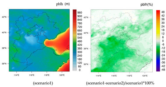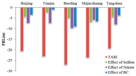 The ARI reduced the PBLH in the region by 5~30 m, as shown in Figure 9. The mean contribution of the ARI to the PBLH in December saw between a 6.56% to 10.3% decrease in the five typical cities in the BTH region. The PBL was reduced by 20.64 m, 23.17 m, 27.08 m, 23.70 m, and 19.40 m in Beijing, Tianjin, Baoding, Shijiazhuang, and Tangshan, respectively. The PBL decreased in the region due to NO3−, SO42−, and BC emissions, as shown in Figure 10. The PBL fell by averages of 7.41 m, 7.36 m, 9.79 m, 5.95 m, and 8.04 m in Beijing, Tianjin, Baoding, Shijiazhuang, and Tangshan, respectively, due to nitrate. The PBL fell by averages of 4.42 m, 2.34 m, 5.05 m, 6.88 m, and 4.59 m in Beijing, Tianjin, Baoding, Shijiazhuang, and Tangshan, respectively, due to sulfate. The PBL fell by averages of 3.54 m, 1.06 m, 9.09 m, 6.70 m, and 3.89 m in Beijing, Tianjin, Baoding, Shijiazhuang, and Tangshan, respectively, due to BC. The effect of the TARI made the average PBLH decrease by 25.8 m in the region during the PM2.5 pollution period and decrease by 20.07 m during the nonheavy pollution period (shown in Table 6). Sulfate aerosols decreased the average PBLH in six cities by 4.68 m during the PM2.5 pollution period and decreased it by 4.51 m during the non-PM2.5 pollution period. The nitrate and BC aerosols caused the PBLH to decrease by averages of 8.52 m and 7.79 m, respectively, during the pollution period and by 6.96 m and 2.22 m, respectively, during the nonpollution period.