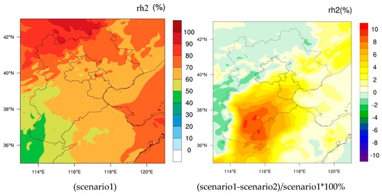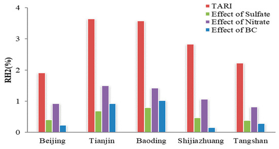 The monthly average RH2 exhibited obvious increases in the middle and southern parts of the BTH region, as shown in Figure 11. In Beijing, Tianjin, Baoding, Shijiazhuang, and Tangshan, the mean spatial contributions of the ARI to RH2 over the simulation period were approximately 1.93%, 3.61%, 3.67%, 2.81%, and 2.22%, respectively. The RH2 increased in the five cities due to the aerosol feedback effects of NO3−, SO42−, and BC, as shown in Figure 12. Nitrate increased RH2 by averaging 0.92%, 1.50%, 1.42%, 1.07%, and 0.81% in Beijing, Tianjin, Baoding, Shijiazhuang, and Tangshan, respectively. Sulfate increased RH2 by averages of 0.40%, 0.68%, 0.80%, 0.47%, and 0.39% in Beijing, Tianjin, Baoding, Shijiazhuang, and Tangshan, respectively. BC increased RH2 by averages of 0.23%, 0.93%, 1.03%, 0.16%, and 0.28% in Beijing, Tianjin, Baoding, Shijiazhuang, and Tangshan, respectively. The effect of the TARI increased the RH2 in the region by an average of 4.40% during the pollution period and increased that by an average of 1.24% during the nonheavy pollution period (shown in Table 7). Sulfate aerosols increased the average RH2 by an average of 0.80% during the pollution period and 0.07% during the nonpollution period. Nitrate and BC aerosols increased RH2 by averages of 1.69% and 1.05%, respectively, during the pollution period, and 0.53% and 0.05%, respectively, during the nonpollution period.