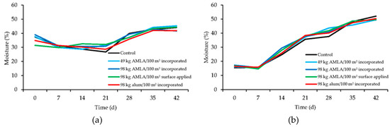 The highest NH3 flux measured in this study (1052 mg NH3-N m−2 hr−1) was measured in the control treatment at day 0 of flock 2 (Table 5), which was likely due to the buildup of NH4-N from flock 1. One of the most important times to have low NH3 concentrations in poultry rearing facilities is at the beginning of a flock, since 1-d-old chicks, which are very susceptible to high NH3 levels are placed in the chicken houses [30]. Alum mud litter amendments and alum during day 0 reduced NH3 emissions by 51–82% for flock 2, with the high rate alum by 71% and AMLA by 82%. At day 7, the high rate of incorporated AMLA (370 mg NH3-N m−2 hr−1) was statistically lower than the untreated litter (694 mg NH3-N m−2 hr −1), whereas alum was not. There were no statistical differences between treatments observed in NH3 emission for the remaining five weeks (days 14 to 42) in flock 2. The overall cumulative emissions (Figure 4a) were significantly lower compared to untreated litter (574 g NH3-N m−2) for the high rate of incorporated and surface applied AMLA (370 and 380 g NH3-N m−2, respectively). These were not significantly different from incorporated alum (403 g NH3-N m−2). This represents a 36%, 34%, and 30% reduction in NH3 volatilization for high rates of incorporated AMLA, surface applied AMLA, and incorporated alum, respectively, during flock 2. The higher litter moisture at the start of this flock may potentially have caused rapid dissolution of alum and AMLA. This could cause the acidity from the amendments to be neutralized relatively early on in the flock.