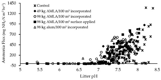 Ammonia flux (mg NH3-N m−2 hr−1) as a function of litter pH.