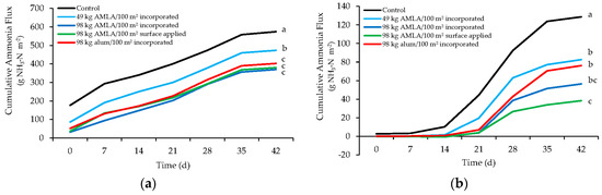 Cumulative ammonia flux (mg NH3-N m−2) for (a) flock 2 and (b) flock 3 as a function of time. Treatments on day 42 not sharing a common letter are significantly different (p < 0.05).