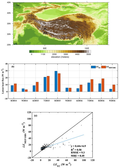 The Tibetan Plateau (TP), with an average elevation of 4500 m, is the highest plateau in the world. It plays an important role in elevating the heat sources into the middle troposphere over the Eurasian continent in summer, and profoundly influences the Asian summer monsoon, regional energy and water cycles, and environment changes [1]. The TP has been experiencing warming and wetting since the mid-1950s, which has led to an array of complex meteorological, hydrological, and ecological changes [2,3,4,5,6]. Therefore, to better understand the land-atmosphere interactions underlying regional and global climate pattern, the reliable estimations of surface thermal effects of the TP are essential. One component of the surface energy balance is the surface latent heat flux (LE). It represents the heat flux from the Earth’s surface to the atmosphere associated with the surface evaporation or water [7,8]. Several intensive field experiments have been conducted off and on to measure LE over the TP since the 1970s [9,10,11,12]. However, the field experiments sites on the TP cannot cover the entire TP region; in particular, the sites are mainly distributed over the central-eastern TP, sparse in the western TP.