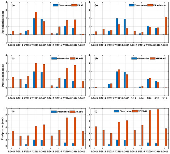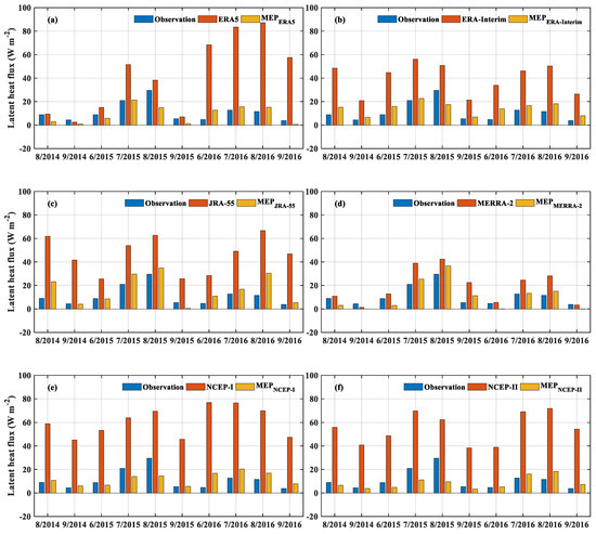 Previous studies indicated that surface energy fluxes during summer are mainly affected by precipitation, especially in arid regions [30,31,32]. To explore the reasons for the difference in LE of the six reanalysis datasets, we analyzed the summer reanalysis precipitation. The varying features of the summer reanalysis precipitation are generally similar to that of the observed precipitation during 2014–2016, with the maximum precipitation occurring in July-August (Figure 5). However, the summer-averaged precipitation values of the six reanalysis datasets are generally greater than the observation (0.64 mm), especially for JRA-55 (1.7 mm), NCEP-I (5.6 mm), and NCEP-II (7.1 mm). The summer-averaged precipitation values of ERA5, ERA-Interim, and MERRA-2 are 1.0, 0.83, and 0.65 mm, respectively. The RMSE values of the precipitation of ERA5, ERA-Interim, JRA-55, MERRA-2, NCEP-I, and NCEP-II are 2.4, 2.3, 2.6, 2.2, 5.9, and 7.4 mm, respectively. The RMSE of MERRA-2 precipitation is smallest. Based on the above analysis, the MERRA-2 LE and precipitation perform best among the six reanalysis datasets. Therefore, the errors in precipitation may lead to a large uncertainty in the reanalysis LE. In addition, the difference in the parameterization of the moisture transfer coefficient, surface roughness lengths, and wind speed may also lead to the conspicuous differences among the six reanalysis LE data [33,34,35].Since the parameterization scheme of the MEP model may be able to reflect the surface humidity condition, the uncertainties of the estimated LE using the MEP model can be substantially reduced compared with the reanalysis LE [20,29].