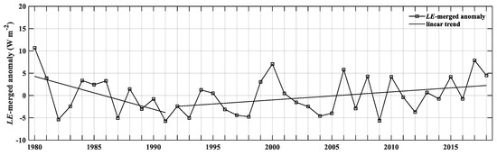 The LE-merged presents a significant variation from 1980 to 2018. Han et al. (2017) reported that LE presented an upward trend between 0 and 2 W m−2 year−1 from 2001 to 2012. During this period, LE-merged also shows an upward trend of 0.8 W m−2 decade−1. It is evident that LE over the western TP shows a complicated feature during a long period under the influence of climatic and environmental factors.