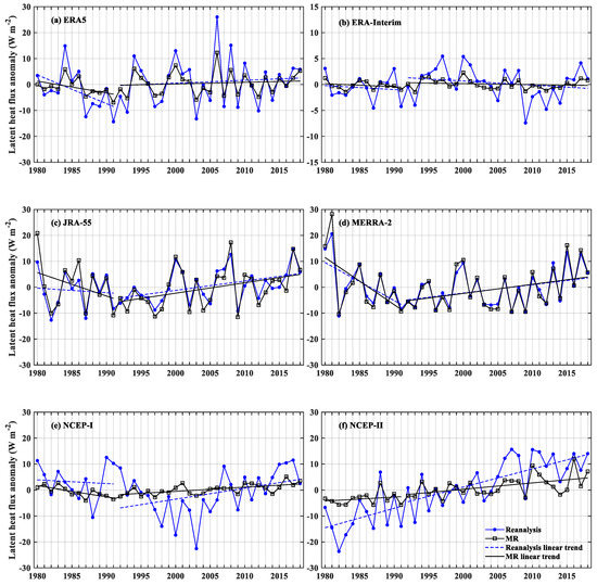 To explore the variability of LE at the Ali site, the long-term series of LE-merged is analyzed in this study. In Figure 3, LE-merged generally fluctuates between 1.8 and 18.1 W m−2, with the mean value of 7.4 W m−2, and showing a decreasing trend of −7.4 W m−2 decade−1 during 1980–1991 and an increasing trend of 1.8 W m−2 decade−1 during 1992–2018. For the whole period 1980–2018, LE-merged generally presents an increasing trend of 0.3 W m−2 decade−1. The MR LE and the reanalysis LE of ERA5, JRA-55, MERRA-2, and NCEP-I show the similar variations to LE-merged, with the decreasing trend during 1980–1991 and the increasing trend during 1992–2018 (Figure 4a,c–e), especially for both LEMEP MERRA-2 and LEMERRA-2 (Figure 4d). But the features of the ERA-Interim and NCEP-II MR LE and reanalysis LE series are quite different from those of LE-merged (Figure 4b,f).