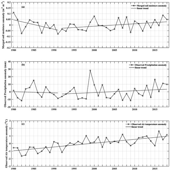 The temporal series of (a) the summer soil moisture () anomaly of the merged dataset at the Ali site during 1980–2018; (b) same as in (a) but for the summer observed precipitation; (c) same as in (a) but for the summer observed air temperature.
