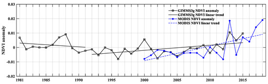 Moreover, a warmer and wetter environment may help vegetation growth. Figure 7 shows the summer NDVI values during 1981–2018, in which the NDVI values during 1981–2015 are obtained from GIMMS3g and those during 2000–2018 are obtained from MODIS. Both of GIMMS3g and MODIS NDVI show increasing trends during 2000–2015. GIMMS3g NDVI shows a decreasing (an increasing) trend during 1981–1991 (1992–2015). It is evident that corresponding to the increasing trend of and the decreasing trend of precipitation during 1981–1991, NDVI presents a decreasing trend. While corresponding to the increasing trends of both and precipitation during 1992–2018, NDVI shows a general increasing trend. NDVI may affect variations of LE through modulating surface vegetation evapotranspiration and surface roughness, and is positively correlated with the land surface energy and water cycles [43,44]. Therefore, the consistent trends of LE-merged and NDVI (shown in Figure 3 and Figure 7) suggest a possible effect of NDVI on LE at the Ali site.