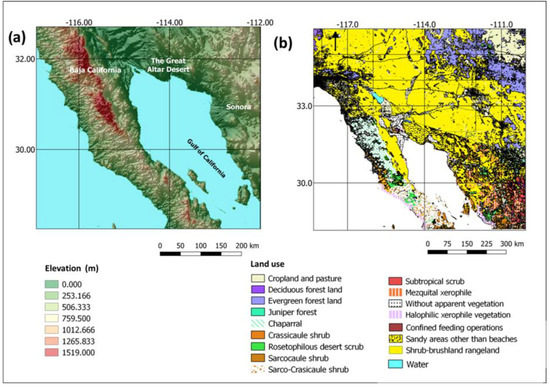Dry and arid conditions determine the climate of the study area where predominate the arid, semi-dry, desert with temperate zones and warm desert [38]. The land use and the vegetation cover correspond to vegetation from arid lands. There are different types of scrub with most dominanct being microphyllous scrub [36]. For the Great Desert of Altar, the vegetation is for sandy desert and barren areas. On the west coast of Sonora, most of the vegetation cover is microphyllous scrub, with some areas covered by sarcocaulescent desert shrubs, xerophile mezquital, as well as induced and cultivated pastures [36].