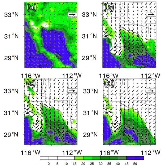 Initially, dust emissions were irrelevant in the entire domain (Figure 7a). Significant dust emission starts at the northern side of the Desert of Altar when wind direction turns to south at 07:00 UTC on October 21 and one hour after, wind speed increase to 8 m/s over the Desert of Altar causing the start of erosion, emitting concentrations above 3000 µg/m3. Wind intensification between 9:00 UTC and 19:00 UTC on October 21 with southeast direction transport substantial quantities of dust over the Gulf of California. At 00:00 UTC on October 22, the dust emission produced dust concentrations of more than 10,500 µg/m3 (Figure 7b). Dust concentration reach values above 10,000 µg/m3 on Sonora’s coast, and 8000 µg/m3 above the Gulf of California. The mean dust concentration above the Gulf of California at the first hours of October 21 is low, under 100. Between the 18:00 UTC and 22:00 UTC on October 21, the mean concentration has a sharp increase in reaching about 6550 µg/m3. Dust concentrations remained very high in coastal areas on the mainland side on October 23 and 24 and generally high over the Gulf of California (Figure 7c,d). The most critical emission area the Desert of Altar on October 21. The wind speed reaches 10 m/s over the east coast of the Gulf of California (Sonora’s west coast) at 17:00 UTC. At 22:00 UTC the area of emission grows from the Desert of Altar to Guaymas. Figure 7 reveals that the wind can transport dust from the Sonora’s coast to the Pacific Ocean, crossing over the Gulf of California and the Peninsula of Baja California through elevations that allow it. Through October 23 and October 24, the mean dust concentration over the Gulf of California decreases slightly along with the wind speed reaching lower concentrations.