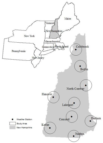 This study evaluates trends in extreme weather events across New Hampshire and links these extreme events to adverse health outcomes. Using data from National Oceanic and Atmospheric Administration’s (NOAA’s) National Center for Environmental Information (NCEI), 35 years of data (1981–2015) were downloaded from nine weather stations across the state (Figure 1). The study areas were defined as the 10-mile area surrounding the nine weather stations in the communities of Berlin, Colebrook, Concord, Durham, Hanover, Keene, Lakeport, Nashua, and North Conway. Daily maximum temperature, daily minimum temperature, and daily precipitation were extracted from the Global Historical Climatology Network- Daily (GHCN-Daily) dataset [17,18]). These continuous variables were used to create five categorical extreme weather metrics (EWMs): daily maximum temperature ≥90 °F (heat metric 1; HM1), daily maximum temperature ≥95 °F (heat metric 2; HM2), daily maximum temperature ≤32 °F (cold metric 1; CM1), daily precipitation ≥1″ (precipitation metric 1; PM1), and daily precipitation ≥2″ (precipitation metric 2; PM2). These metrics represent the number of days over or under the threshold of interest. The thresholds were chosen as common cutpoints for studying temperature and precipitation extremes. Once these variables were identified, time series of the exposures were evaluated for temporal trends. The Mann–Kendall test for statistical significance was used to determine whether a trend existed, if it was a positive or negative trend, and if it was statistically significant. These metrics are referred to as the exposure variables.