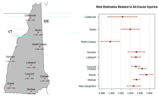 The data suggest a positive relationship between maximum temperature and all-cause injuries (Figure 2). This indicates that as the temperature increases, so does the risk of all-cause injury. A dummy variable for the warm season (May–September; summer) was the additional variable chosen to explain the relationship between all-cause injury-related hospital visits and maximum temperature. The effect of maximum temperature on all-cause injury-related visits was significant (p < 0.05) in seven of the nine study areas, excluding two of the northernmost study areas: Colebrook and North Conway. The relative risk (RR) of all-cause injury-related visits was highest in Keene (1.007 (CI: (1.006, 1.009)) and lowest in North Conway, (0.999 (CI: 0.998, 1.002)), although not statistically significant. The overall RR for NH, based on the meta-analysis, was 1.005 (CI: 1.003,1.006).