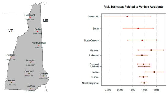 The data suggest a positive relationship between maximum temperature and vehicle accident-related hospital visits (Figure 3). A dummy variable for the warm season (May–September; summer) was the additional variable chosen to explain the relationship between vehicle accident-related hospital visits and maximum temperature. The effect of maximum temperature on vehicle accident-related hospital visits was significant (p < 0.05) in the six most southern study areas (Figure 3). The RR of vehicle accident-related visits was highest in Keene (1.009 (CI: 1.005, 1.013)) and lowest in Colebrook (0.998 (CI: 0.988, 1.008)), although not statistically significant. The overall RR for NH, based on the meta-analysis, was 1.005 (CI: 1.004, 1.006).