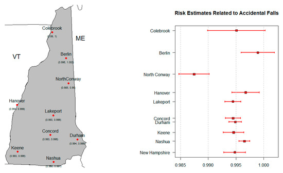 The data show an inverse relationship between maximum temperature and accidental fall-related injuries (Figure 4). This indicates that as the temperature decreases, the risk of falls increases. CM1 (Tmax ≤ 32 °F) was the additional variable chosen to explain the relationship between accidental fall-related hospital visits and maximum temperature. The effect of CM1 on accidental fall-related hospital visits was significant in all study areas except Colebrook, while the effect of maximum temperature was significant (p < 0.05) in all but the two northernmost study areas of Berlin and Colebrook. The RR was strongest in North Conway (0.987 (CI: 0.985, 0.990)) and weakest in Berlin (0.999 (CI: 0.996, 1.002)), although not statistically significant. The overall RR for NH, based on the meta-analysis, was 0.995 (CI: 0.993, 0.997).