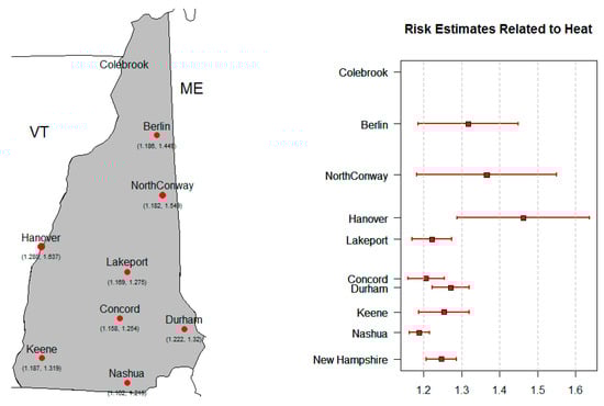 The data suggest a positive relationship between maximum temperature and heat-related hospital visits (Figure 5). HM1 (Tmax ≥ 90 °F) was the additional variable chosen to explain the relationship between heat-related hospital visits and maximum temperature. The effect of maximum temperature on heat-related hospital visits was significant (p < 0.05) in all of the study areas, excluding Colebrook (Figure 5). However, HM1 was significant in all study areas except Berlin, Hanover, and Keene. The RR was highest in Hanover (1.462 (CI: 1.288, 1.637)) and lowest in Nashua (1.188 (CI: 1.162, 1.215)). The overall RR for NH, based on the meta-analysis, was 1.246 (CI: 1.207, 1.286).