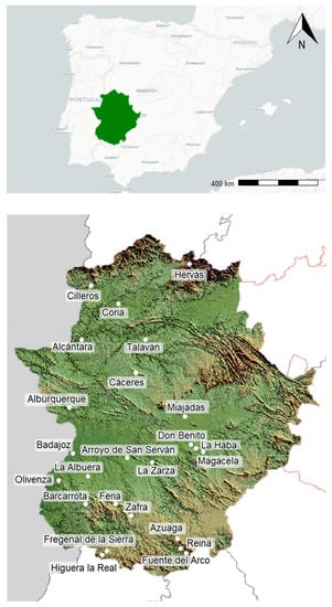 The region of Extremadura is located in interior of the southwest of Spain (latitude between 37°57′ and 40°29′ N, longitude between 4°39′ and 7°33′ W). Figure 1 (on the bottom) shows all the locations inside this region where rogation ceremonies (in this work recovered) were celebrated.