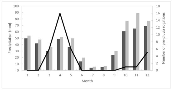 The mean monthly precipitation of Badajoz (dark grey vertical bars) for the period 1981–2010 and Cáceres (light grey vertical bars) for the period 1982–2010. Black line shows the number of pro-pluvia rogations celebrated in Extremadura region in the period 1824–1931.