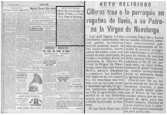 An example of a rogation ceremony registered in the newspaper Nuevo día: diario de la provincia de Cáceres in May 1927 in Cilleros (north of Extremadura) and it can be read: “Religious act. Cilleros brings its patron saint, the Virgin of Navelonga, to the parish in a prayer for rain. […] severe damages occurred in agriculture, due to an extensive drought that is taking place during the current spring. […]”.
