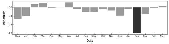 Pro-pluvia rogations were celebrated when there truly was a need for rain. So, a deficit of precipitation had occurred in the previous months. As was aforementioned in Section 2.1., the agricultural droughts (3 to 6 months) in Extremadura region show the highest mean duration i.e., from 10 to 20 weeks. Therefore, it is possible to find out anomalies in the monthly NAO index in previous months related to the precipitation deficits. Specifically, this fact occurs in winter months when the influence of NAO in the precipitation is higher. NAO index anomalies are calculated using as reference period the complete study period (1824–1931). To study the possible influence of two previous winters on the months of the celebration of the rogation, anomalies in the monthly NAO index are calculated from the month of the celebration of the rogation up to two winters before(that is 15 months, see Figure 4). Monthly anomalies are computed for each of the 21 dates of rogations and the monthly average is calculated.
