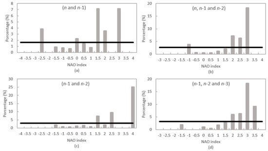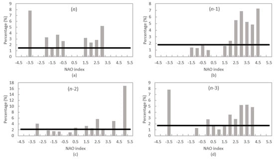 Keeping in mind these results, the relationship between the celebration of pro-pluvia rogations in month n and the monthly NAO index in previous months (n, n-1, n-2 and n-3) will be studied in more detail while using the contingency tables. Figure 5 shows the percentage of pro-pluvia rogations celebrated corresponding to each interval of the NAO index. Figure 5 shows the association between pro-pluvia rogations and the NAO index in months n (a), n-1 (b), n-2 (c) and n-3 (d). Black lines are the distribution of the null hypothesis (no-dependency of both series) for each case. Regarding to rogations were celebrated when dry conditions appear and these conditions are related to positive values of the NAO index [30,41,59], it can be seen in Figure 5b–d that the number of positive values of the NAO index is greater than the number of negative values, that is, focusing only on the NAO index axis. On the contrary, in Figure 5a, negative values of the NAO index are almost equal to the number of positive values. A possible explanation could be in the day of the celebration of the pro-pluvia rogation: if the rogation ceremony is celebrated at the beginning of the month, the n NAO index has no relation with the drought that trigger the rogation ceremony.