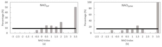 It can be seen in both plots (Figure 7a,b) that the number of positive values of the NAO winter index are much greater than negative values. Also, most percentages correspond to positive values in both. In this analysis, only the average of the NAO index in winter is considered; i.e., month n is removed from the analysis and the direct effect of the previous month are shown.