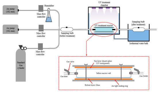 An experimental system to evaluate gas emission reduction efficacy under UV-A irradiation was based on a modified setup from previous research, Figure 1 [21,30]. Three mass flow controllers were used to control the dilution of the standard gases and pure air and the RH. A 500 mL glass gas sampling bulb (Supelco, Bellefonte, PA, USA) was installed before and after the UV treatment reactor. The standard gases flowing through the 200 mL reactor were irradiated with UV-A through a quartz window. The reactor bottom was made from an ordinary glass that was coated with a photocatalyst (nanostructured TiO2 at 10 μg·cm−2 from PureTi, Cincinnati, OH, USA). The reactor temperature was maintained at 25 ± 3 °C while the heat generated by the UV lamps was discharged from the UV chamber by circulating-cooling tubes connected to the isothermal water bath.