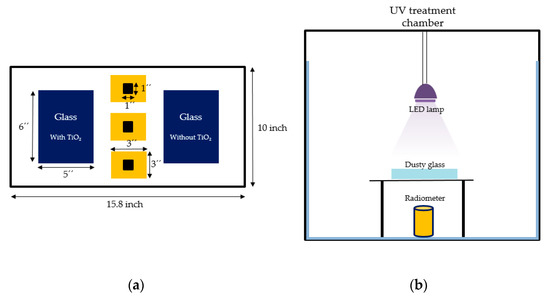 Investigation of the effect of accumulated poultry dust on photocatalysis. (a) Dust collection box; (b) Schematic of the method used for measuring the light absorption by the accumulated dust on the glass (i.e., the bottom layer of the reactor in Figure 1) with and without TiO2.