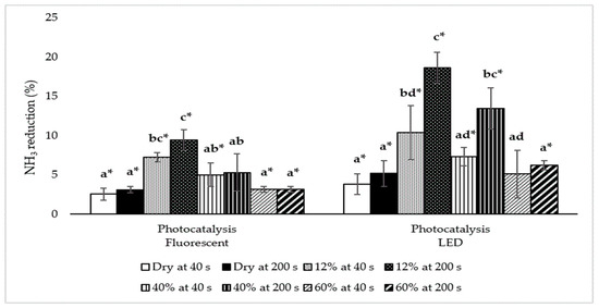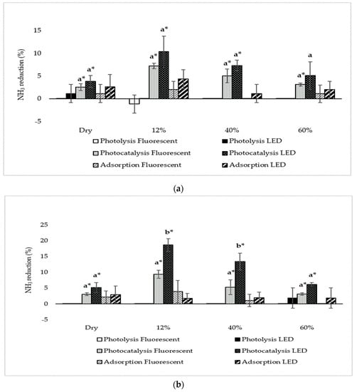 Comparison of NH3 mitigation under different treatment types and light intensities. (a) % reduction at treatment time of 40 s; (b) % reduction at treatment time of 200 s; Superscript (*) signifies a statistical difference compared to the control (p < 0.05), and the different characters (a, b) signify statistical difference when comparing different light intensities (fluorescent vs. LED) at the same relative humidity (p < 0.05). The % reduction was the highest at 12% (7.3–18.7%, p < 0.05). Error bars signify ± standard deviation.