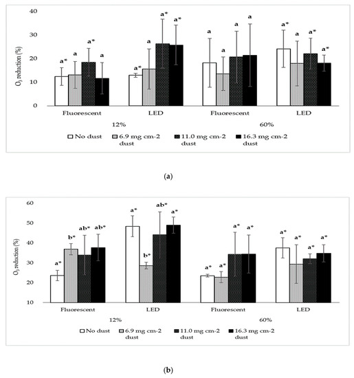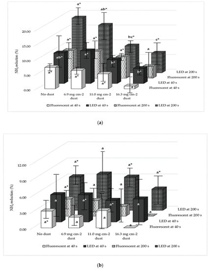 Comparison of NH3 mitigation under different poultry dust levels. (a) % reduction at relative humidity of 12%; (b) % reduction at relative humidity of 60%; Superscript (*) signifies a statistical difference compared to the control (p < 0.05), and the different characters (a, b, c) signify statistical difference at the same treatment time and the same light intensity (p < 0.05). Error bars signify ± standard deviation.