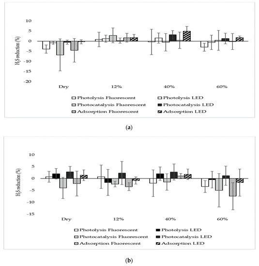 Comparison of H2S mitigation under relative humidity. (a) % reduction at a treatment time of 40 s; (b) % reduction at a treatment time of 200 s. Error bars signify ± standard deviation.