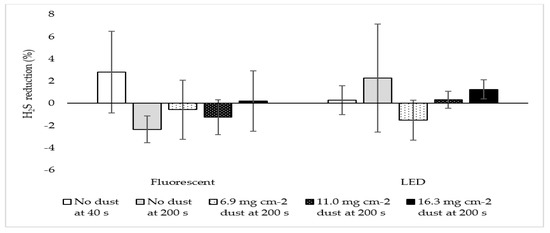 The controlled H2S concentration in the control group using the standard gas was 0.52 ± 0.02 ppm. No statistically significant reduction in H2S concentration was observed under any experimental conditions (p > 0.05), even with the most favorable conditions of 200 s, photocatalyst usage, LED irradiation, and elevated moisture (Figure 6). Similarly, there was no statistical difference associated with the dust accumulation at 12% RH regardless of the light type (intensity) and treatment time (Figure 7).