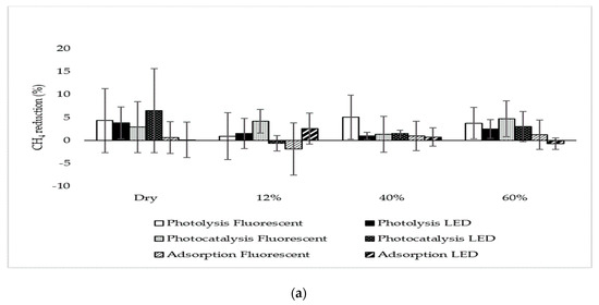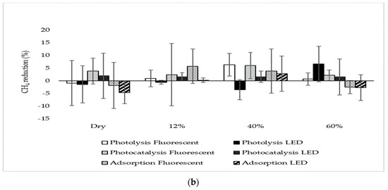 Comparison of CH4 mitigation under relative humidity. (a) % reduction at a treatment time of 40 s; (b) % reduction at a treatment time of 200 s. Error bars signify ± standard deviation.