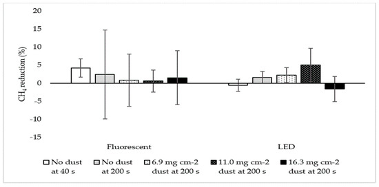 CH4 mitigation under different poultry dust levels at 12% relative humidity in photocatalysis. Error bars signify ± standard deviation.
