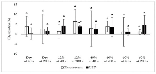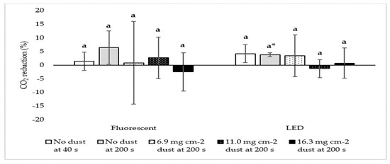 CO2 mitigation under different poultry dust levels at 12% of relative humidity in photocatalysis. Superscript (*) signifies a statistical difference compared to the control (p < 0.05), and the character (a) signifies there is no statistical difference under the two different treatment times (p > 0.05). Error bars signify ± standard deviation.