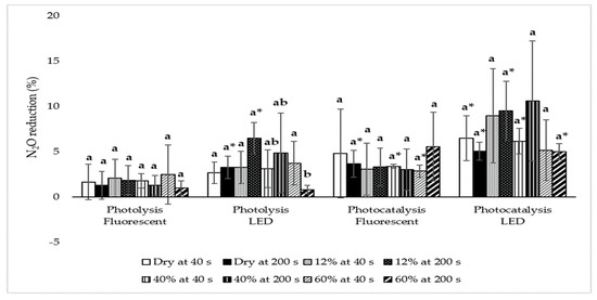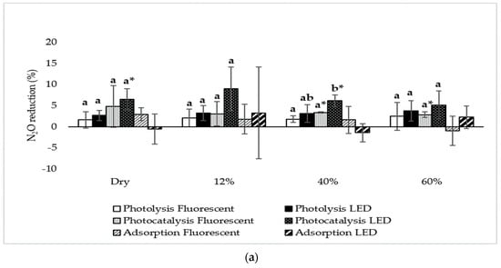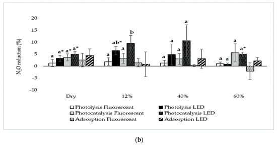 Comparison of N2O mitigation under different treatment types and light type intensity. (a) % reduction at treatment time of 40 s; (b) % reduction at treatment time of 200 s; Superscript (*) signifies a statistical difference compared to the control (p < 0.05), and the different characters (a, b) signify statistical difference when comparing different light intensities (fluorescent vs. LED) at the same relative humidity (p < 0.05). Error bars signify ± standard deviation.
