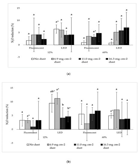 Comparison of N2O mitigation under different poultry dust levels at 200 s of treatment time. (a) % reduction at a relative humidity of 12% and 60% in direct photolysis; (b) % reduction at a relative humidity of 12% and 60% in photocatalysis. Superscript (*) signifies a statistical difference compared to the control (p < 0.05), and the different characters (a, b) signify the statistical difference between treatments associated with one UV lamp type and one relative humidity (p < 0.05). Error bars signify ± standard deviation.