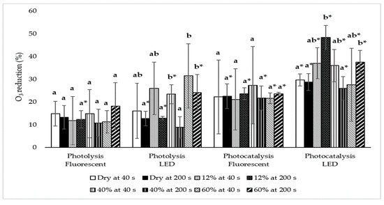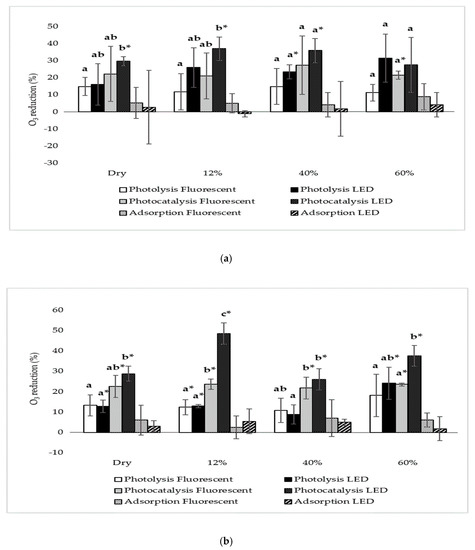 Comparison of O3 mitigation under different treatment types and light intensity. (a) % reduction at treatment time of 40 s; (b) % reduction at treatment time of 200 s; Superscript (*) signifies a statistical difference compared to the control (p < 0.05), and the different characters (a, b) signify a statistical difference when comparing different light intensities (fluorescent vs. LED) at the same relative humidity (p < 0.05). Error bars signify ± standard deviation.