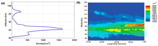 (a) The profile of the sodium density at 21:34 LT (Local Time) on 6 July 2010 and (b) the time-altitude variations of the sodium density from 21:00 LT on 6 July 2010 to 01:00 LT on 7 July 2010.