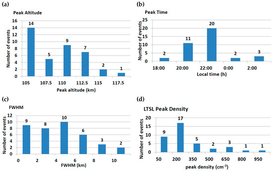 Histogram of (a) peak altitudes, (b) peak times, (c) full width at half maximums (FWHMs), and (d) peak densities of LTSLs.