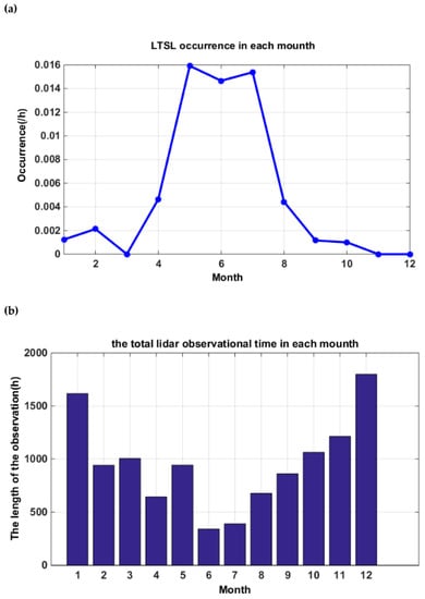 (a) The seasonal variations of the LTSL occurrence rates and (b) the observation time of lidar in each month.